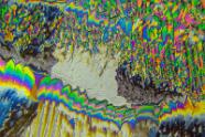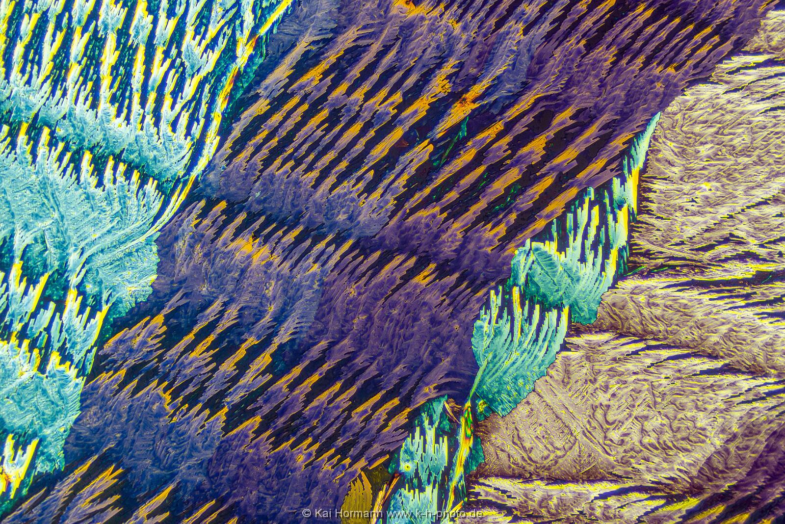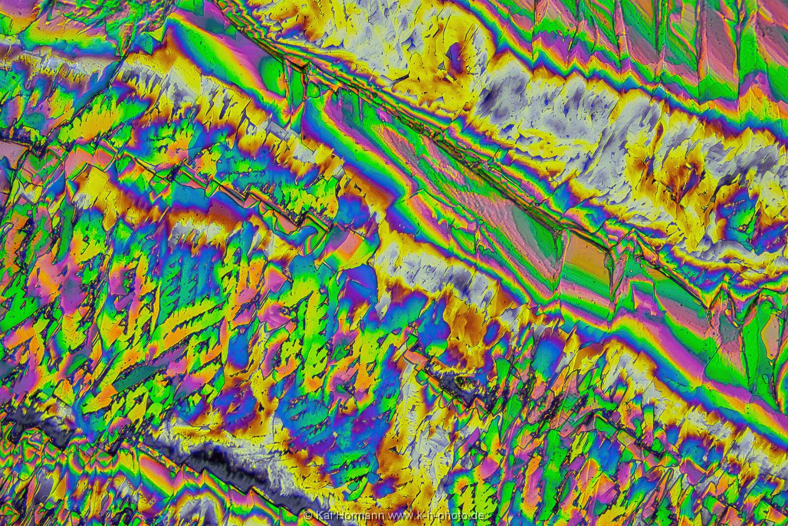 Pyridoxin (Vitamin B6) Mikrokristalle im polarisierten Licht. Mikroskopaufnahme, Vergrößerung ca. 50-100X.